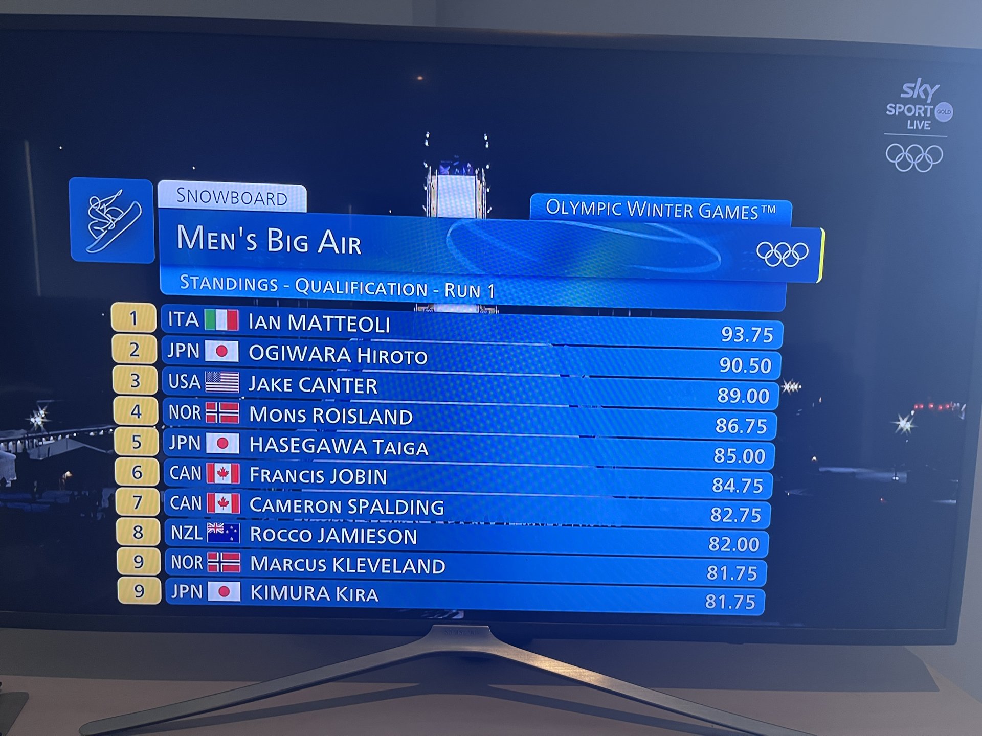 After the first run of three, Rocco Jamieson leads the NZ snowboarders, sitting in 8th place, Dane Menzies is on the bubble in 12th and Lyon Farrell in 23rd. Competitors need to finish in the top 12 to progress to finals.